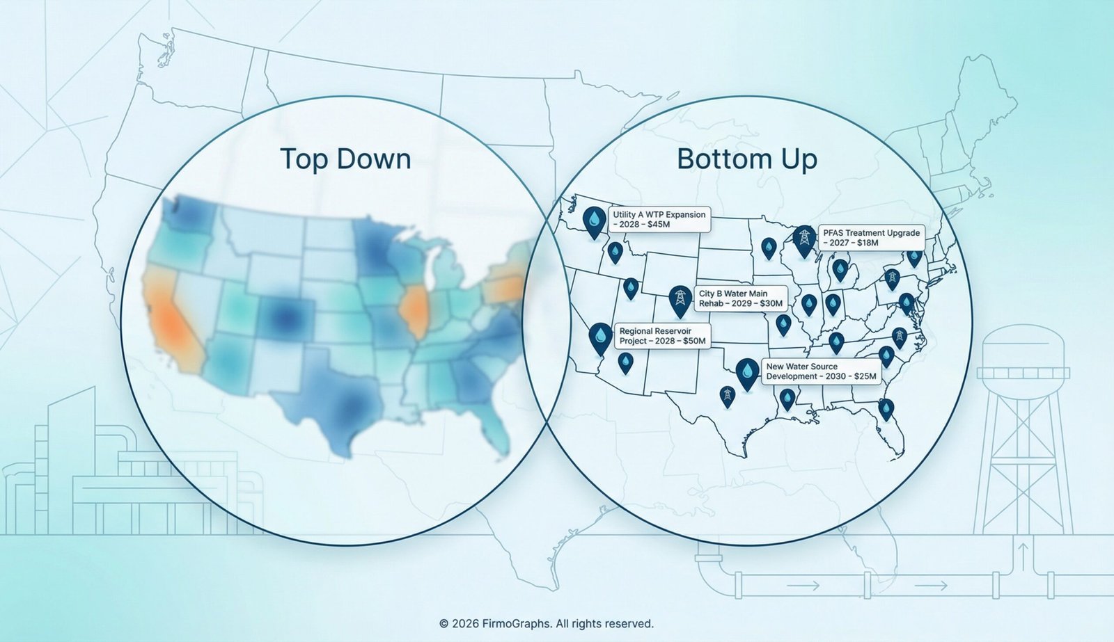 We believe every organization deserves access to the insights needed to make informed, sustainable decisions about water infrastructure. Water-AI by FirmoGraphs delivers the data, intelligence, and foresight that strengthen the U.S. drinking water industry — from utility planning to private investment.