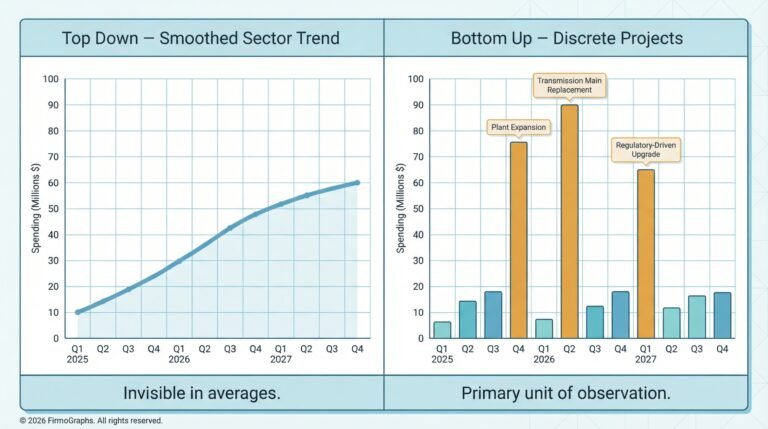 The divergence becomes most apparent in markets characterized by lumpiness—large, discrete investment events that dominate capital flows within a given geography. Regulated infrastructure markets like drinking water are textbook examples; a single plant expansion or transmission main replacement can shift a utility’s capital profile for years. These discontinuities are invisible in top down analysis, where they are smoothed into sector-wide averages. In bottom up analysis, they are the primary unit of observation.