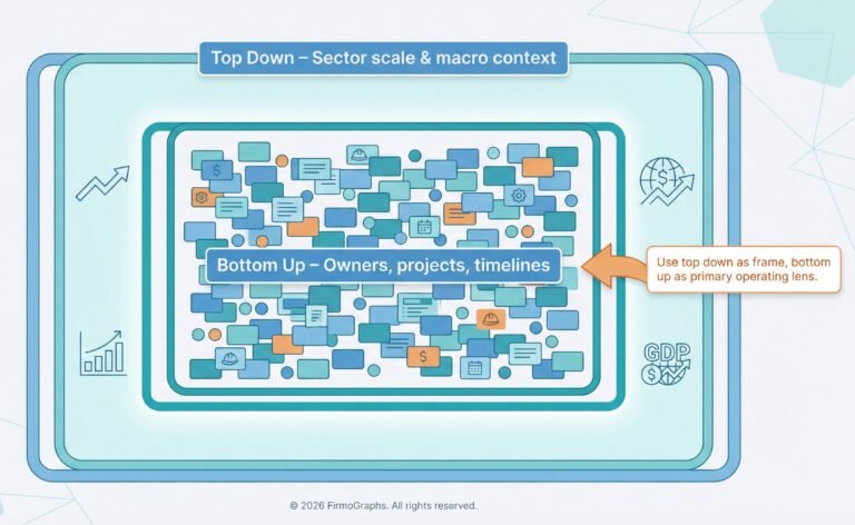 Sophisticated market participants do not choose one methodology to the permanent exclusion of the other. Top down analysis sets the strategic frame—sector scale, growth trajectories, macroeconomic sensitivity. Bottom up analysis drives operational decisions—specific owners, specific projects, specific timelines. The most rigorous approach treats bottom up intelligence as the primary analytical lens and uses top down data as a reasonableness check and contextual frame.